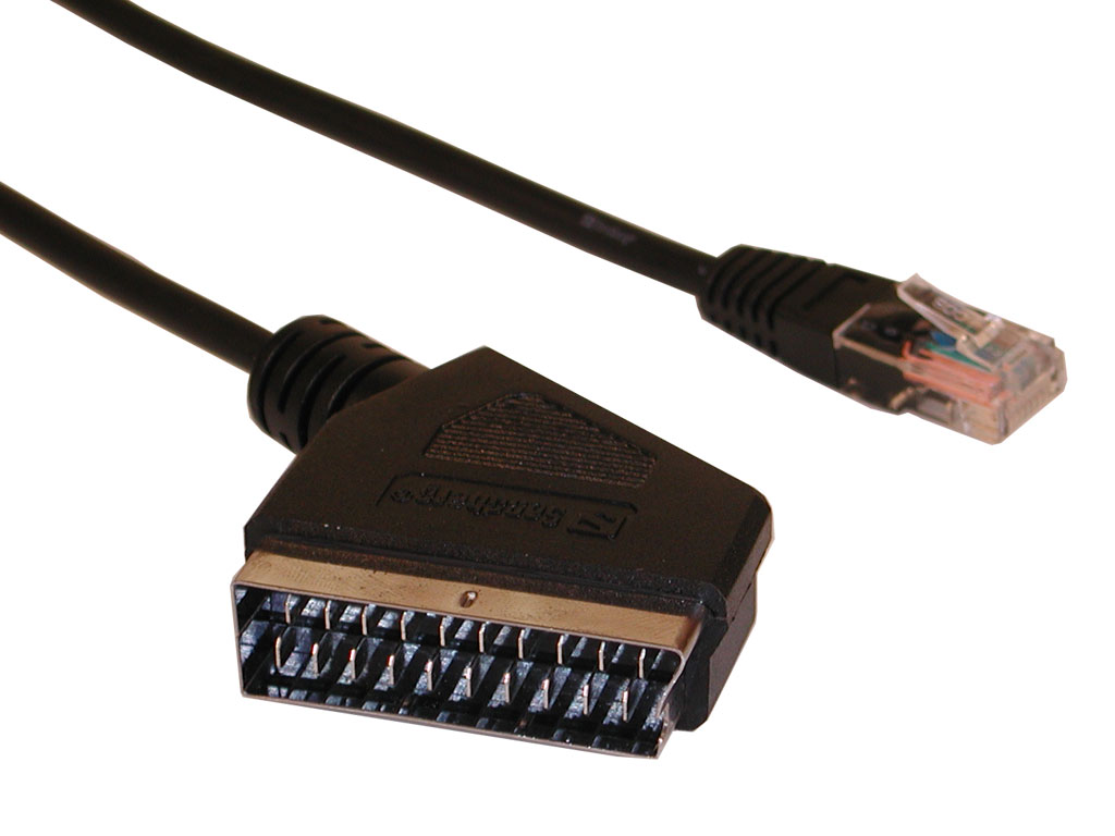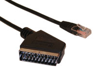 This cable provides completely new possibilities for linking audio and video across your home or office. The Scart plug connects to a television, VCR or other receiving equipment. The RJ45 connector can use a network socket in the wall to carry video and audio signals through an existing network installation to another location via a distributing frame. Extracting the signal requires 504-44 or 503-85.